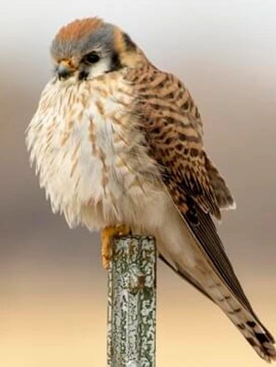 The Kestrel’s coloring is striking, they are reddish brown and beige, with rusty brown and black spots. Females are a darker, with chocolate brown color on top, while Males have blue coloring on their wings. From a distance and depending on lighting, these colors can look peach, orange, even yellow. This is partly why they are difficult to identify in nature.