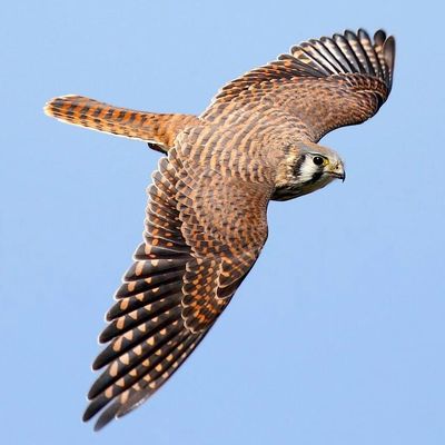 This slender little bird of prey is about the size and shape of an American Robin or Mourning Dove. One way to tell them apart is the American Kestrel has a larger, more rounded head, and large eyes, similar to a Falcon.